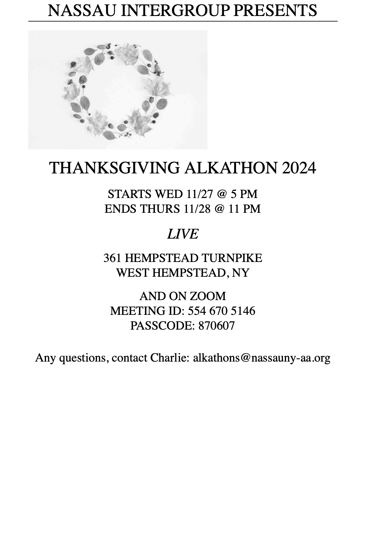 April's Guest Facilitators: Glen Cove Serenity Together Every Second Saturday 10 AM - 11 AM in person: Nassau Intergroup Office 361 Hempstead Turnpike West Hempstead, 11552 and virtually https://zoom.us/j/5546705146 Meeting ID: 554 670 5146 Passcode: 870607 Click image to view printable flyer: